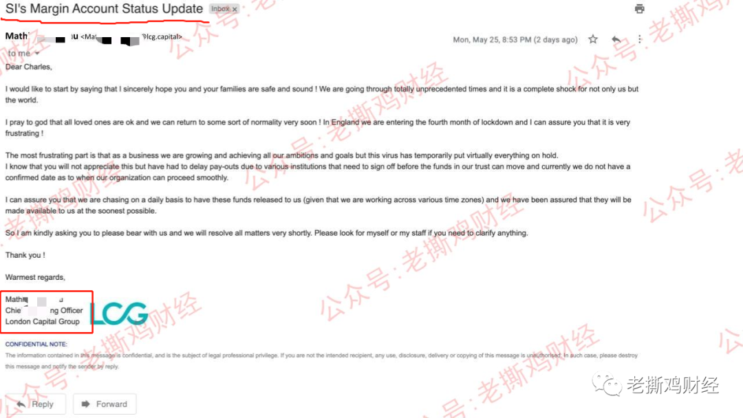 而在2020年1月份跑路以后,项目方又找了个借口,说客户的钱因为公司跟流量商签了什么合作,钱全卡在流量商那里,甚至还煞有介事的发了个邮件截图出来,说是流量商英国London Capital Group公司,承认这件事,正在想办法解决,就这样想把锅甩掉!!